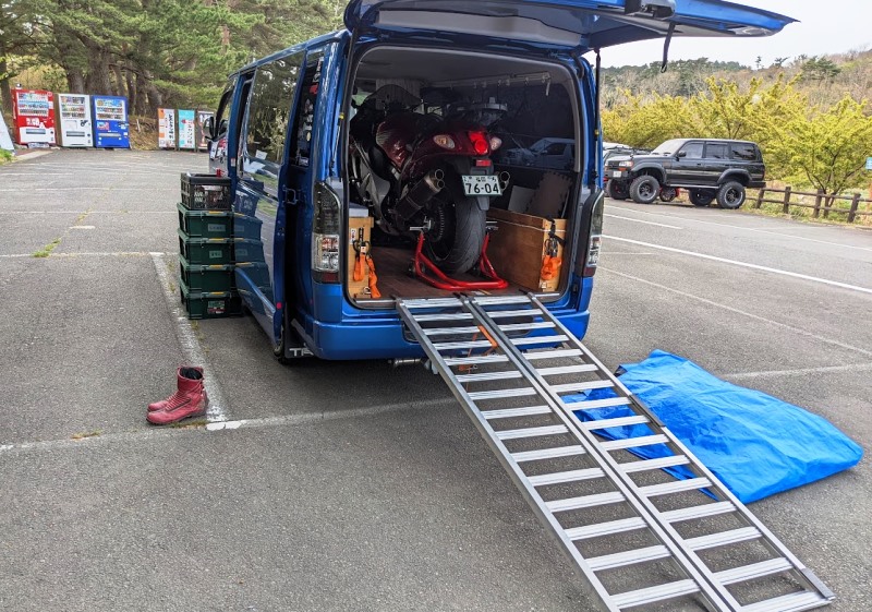 旅の装備はトランポ(バイク運搬車)仕様のハイエース3,000DT4WD、GSX1,300R隼、車中泊&キャンプ道具、それに無期限旅に対応できる着替えと食料など準備してNose-Baseを出発しました。