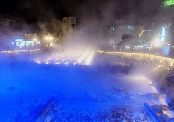 着いたのが19時過ぎだったので、荷下ろしだけして20時頃に食事と温泉浴に向かいました。ホテルの従業員さんに飲食店は源泉がある湯畑の周りに並んでいると聞いたので向かいました。