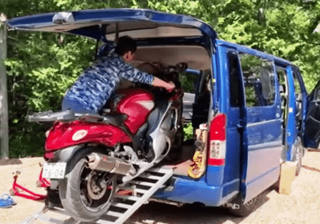 北関東・東北ツーリングの初日は、大阪の能勢町から草津温泉まで一気に行くので、ハイエースに大型バイクのGSX1300R隼を載せて(下写真)移動しました。