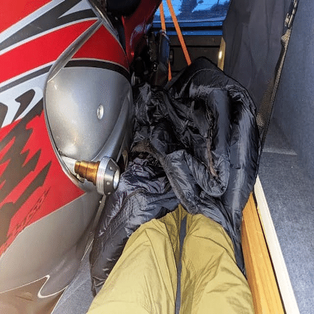 隼を降ろす元気も残っていなかったので、隼に添い寝しました。いつもは大変お世話になっている隼のエンジンガード(転倒時の車体保護)の出っ張りがこの時ばかりは邪魔でした。