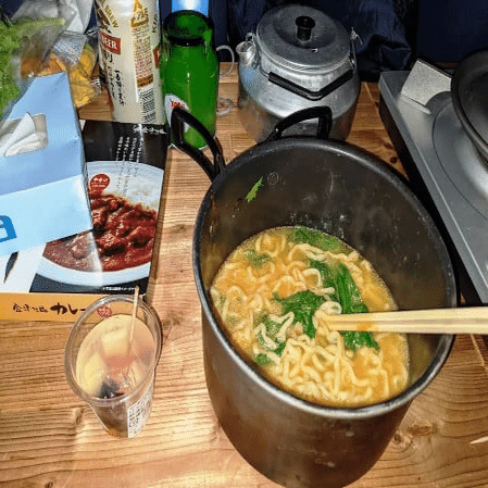 写真のテーブルは後部座席を畳んで、その上にDIYした折り畳み式テーブルを出したものです。右隅に少しだけ写っているカセットコンロでラーメンや熱燗をつくって体を温めてから眠りました。