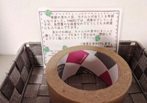 最後の写真はおまけです。文字が小さくて読めないかもしれませんが、このガムテープはカメムシがホテルの室内にいたら、このガムテープにくっ付けてそっと処分してあげて下さいといったことが書いてありました。カメムシって下手に捕まえると悪臭を放つので厄介ですが、こんな取り方があるんですね、知りませんでした。ホテルの気遣いにほっこりしました。