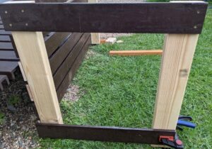波板コーナーが硬いので、先にインパクトドライバーの先にドリルをつけて穴をあけてからドリルねじで固定しました。その他の木材はクランプを使って固定しながら木ねじでとめていきました。普通なら先に塗装してから組み立てた方がもちが良いと思いますが、時短のため先に組み立てて後で塗装しました。あと見えにくいですが、4本足の底には樹脂製のスペーサーをつけて木が直接地面に触れないようにしました。