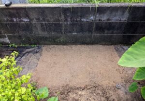 畑の端に方に設置場所を確保して地面を転圧しました。水はけが心配ではありますが、周りが畑なので、蓋さえつけておけば、土が吸収してくれることを願って排水路は考えずに地面露出でとりあえずやってみます。周辺に水溜まりが出来るようなことがあれば、そのとき対策を考えます。