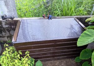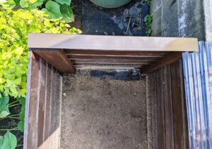 そこで今回は雨の侵入が防げて、天地返しが容易にできる大きさで見た目も不潔感がないコンポストを作ることにしました。桶バージョンである程度の通気性がないとえらいことになるという体験をしたので、横側は隙間を開けて、上は雨水の侵入を防ぐために波板を置くことにしました。風で飛んで行っても困るので両サイドにレール替わりの金具をつけました。
