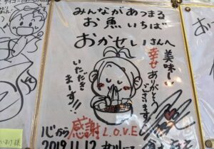 ぼくは「お魚いちば おかせい」さんでおながわ丼を頂きました。近海ものお刺身がたっぷり乗った豪華版です。賑わっているお店なので、鮮度抜群でまだ海水温が低いこの時期は魚の脂の乗りもよく本当に美味しかったです。また海藻が入った味噌汁もツーリングで冷えた体に染みわたりました。さすがはおかせいさん、当確の☆3つでした。ちなみに店舗に飾ってあった有名人のサインでピカイチだったのが、倉木麻衣さんのものでした。実は同じ大学出身なので、一方的に応援しているのですが、こんなに凝ったサインを残していくとはさすがです。ぜひ、このサインも見におかせいさんに行ってみてください。