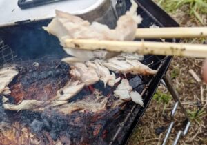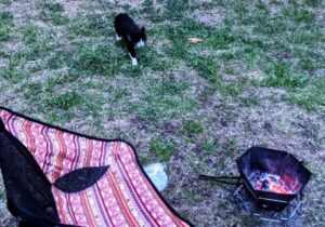 キャンプ場に戻ってから周辺を散策して、火を起こしてソロ宴をスタートしたのが17時でした。今日はのんびりできます。メインディッシュの金華サバ(コバルトラインの先にある金華山から命名?)にたどり着いたときには既に酔っ払っていて、火加減が無茶苦茶で焦がしてしまいましたが、炭の香りもアクセントになって非常に美味しかったです。1尾1,400円だったか、しましたがそれだけの値打ちがある味でした。猫ちゃんも匂いにつられて近寄ってきました。おこげをあげる訳にもいかず、焦げずに残った少ない身を分け合って楽しみました。