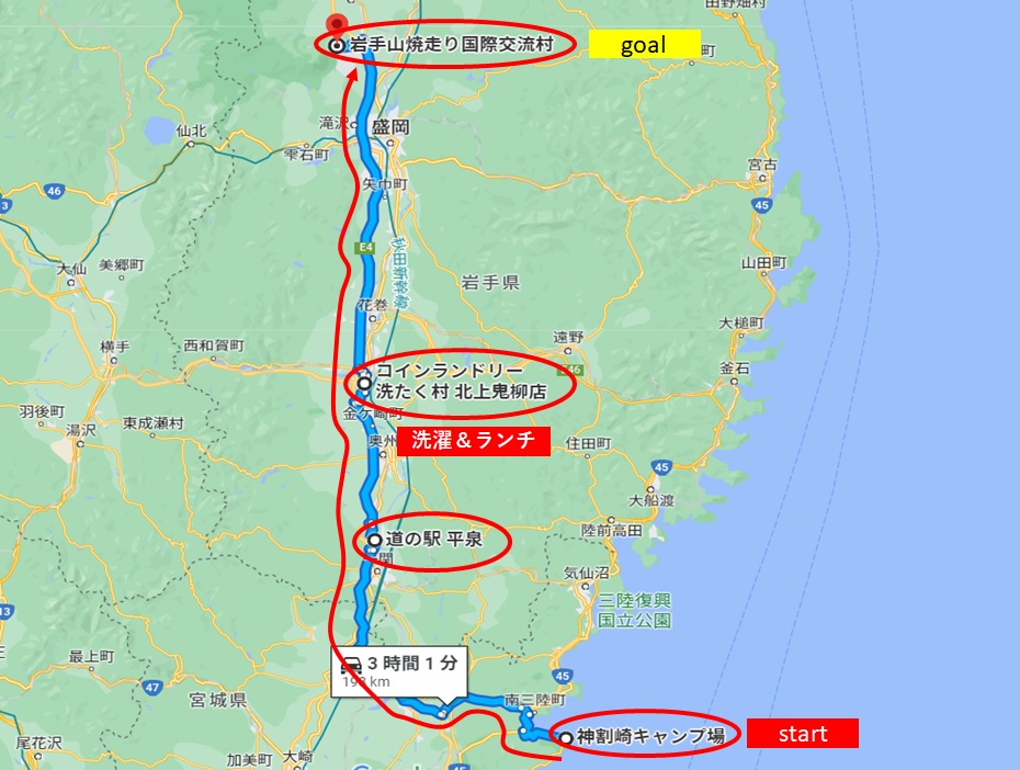 今日は岩手県への移動日です。向かう目的地は岩手山焼走り国際交流キャンプ場です。あと行きたいところがコインランドリーです。もう限界というところから2日間行っておらず、いよいよ着替えが尽きたので、今日は最優先で進みます。