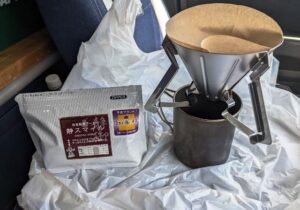 1時間半ほど走ったところでお楽しみの休憩です。世界遺産 平泉 中尊寺にある、なんとも縁起の良い名前の「黄金の花咲く理想郷 道の駅平泉」という施設に立ち寄りました。オープン直後だったようですが、日配品(お弁当など)を陳列している量が半端なかったので、賑わってる施設のようです。ぼくは朝食替わりの団子とコーヒー豆を購入しました。休憩がてら駐車場でコーヒーを淹れて団子を食べました。団子、コーヒーともの☆3つでした。東北に入ってやけに団子系のおやつが美味しくなってきました。さすが、米どころということでしょうか。