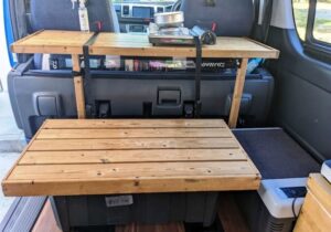 そこでリアシートの上に折り畳み式のテーブルをDIYして設置しました。長椅子は釣り道具入れのBOXの上にテーブルと同じ材料でDIYしたすのこ状のものを置いて使用しています。