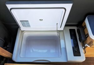 容量が18Lなので、無制限に収納できるわけではありませんが、ソロ車中泊なら容量を意識せずに買い出しできます。2人だとある程度加減して買い出ししています。調節温度範囲は-22℃から+10℃で設定温度まで一気に冷やし切ってくれるイメージです。総重量9.7㎏でちょっとしたブレーキぐらいでは動きません。冷蔵能力、安定感、耐久性、全て合格です。