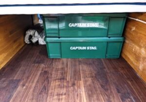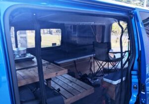 車中泊時、室温調節のためにドアを開けておきたいときもありますが、キャンプ場などは虫が入ってくるのでそうもいきません。そこで、サイドドアとリアに開け閉めOKな蚊帳を装着しています。普段は巻き上げて邪魔にならないようにしまっていますが、キャンプ場に停車した時は活用しています。普段、垂れ下がってきたりして邪魔になることもありますが、キャンプ場では必需品です。