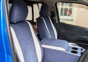 運転席・助手席・リアシートカバーを「CRAFTPLUS California Style type.1」、センターコンソールボックスを「CRAFTPLUSst.1Design series」、ベッドキットを「CRAFTPLUSベッドキットCP100」にして全塗装されたブルーと合わせてデザインを統一しました。