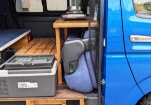 後部座席の上のDIYテーブルの上に備え付けて使用しています。走行中はタイダウンベルトで固定していて、使用時にはそれを外します。常にテーブルの上にあるので、手軽にコーヒーを淹れたり、インスタントラーメンをつくったりしています。以前はグリーンボックスの中に入れていたので、キャンプ場以外では出番がなかったのですが、置く位置を変えてから、使用頻度が大幅にアップしました。