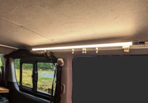 はじめは写真にあるバーライト2本を両サイドにつけようと思っていたのですが、たまたまこのライトがネットで1本しか在庫がなくて、とりあえず1本注文して付けてみたところ、1本で充分な明るさが得られたので、追加発注せずに1本だけで車中泊しています。写真は昼間なのでそれほど明るく見えませんが、周りが暗くなると、明るすぎるほどなので、これで十分です。車載バッテリーから電源を取っているのですが、この照明の消費量は殆ど意識する必要もないレベルだと思います。ハイエースの天井のモールにはいくつかビスが打てるところがピンで止まっているので、そこを外して、ビスで照明器具を固定し、コードは露出で車載バッテリーに繋いでいます。コードクリップでガラスの際を這わしているので、目についたり、ひっかかったりすることはありません。