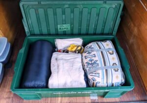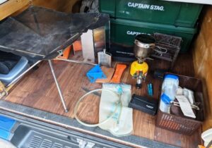 このボックスはハイエースの外、主にキャンプ場で使うものをまとめて入れています。バーベキューコンロ2人用、タープテント、カセットボンベ、折りたたみテーブル、消毒グッズ、鍋セット、まな板、調理器具、食器類、あとペグを打ち込むハンマーやモーラナイフ、バッテリー照明器具、蚊取り線香RED、養生テープなど、テントを張って外でバーベキューする道具です。