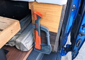 薪を割るには非力ですが、ハイエースが水没したら、きっとこの斧でガラスを割って脱出できることでしょう。また夜の車中泊時に悪党が押し寄せたら武器になるかも知れません。ぼくは戦わずに降伏する思いますが・・・。