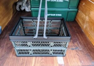 スーパーで買い物中は折りたたんでおいて、詰めるときに広げて使用します。車に持ち帰るとそのまま置いておけるのが良いところです。カーブで崩れることもなく、キャンプ場ではそのまま食材ラックになります。
