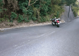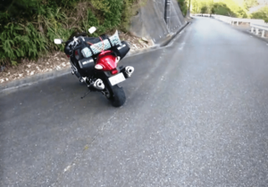 その時、緩い左カーブを越えたところで左側に路肩がありました。あっ、良いところに路肩あると思って、直ぐに指示器を出して停車モードに切り変え、車体を左側に向けました。しかし、それがぼくにとってはワナでした。上り坂を走っていたことやカーブを左に折れたので、地面が左下がりの鋭角になっていることをうっかりして、普通に左足を出して停車しようとしたら、足が届かないのです。ぼくは身長が178㎝なので、普段だと停車するときはかかとまで両足が地面に付くのですが、この場所ではつま先すら届きませんでした。