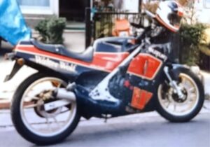 ぼくのバイクとの出会いは高校1年生の夏に遡ります。16歳の誕生日が来てすぐに免許を取得し、そのままバイク屋さんに駆け込んで当時流行っていたレーサーレプリカのRG250Γ(ガンマ)Walter wolf仕様を購入しました。若気の至りといいましょうか、京都の周山街道で転倒して1年余りでお別れしました。写真は38年前に撮った写真をさらにスマホで撮ったものなのでボケててすみません。当時の彼女の家の前で撮った唯一の写真です。ちなみにこの彼女が嫁さんです。