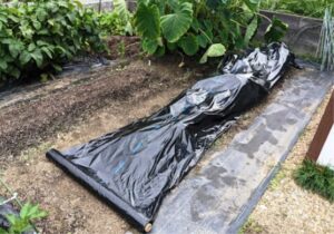 イチゴの苗を植え付けるついでに防寒・雑草対策でマルチを張りました。ジャガイモ同様、芽が出たあとで張りましたが、ニンニクは芽や葉が細くてまっすぐ伸びているので穴を開けたところに簡単に通すことが出来ました。