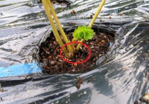 そう聞くと仕入れてきた苗に問題(上の写真)があることが分かりました。ひとつは2本あるランナーのうち1本が折れていて今にも切れてしまいそうなものでした。別の苗はポットの土の中にクラウンが完全に隠れている状態で、土がクラウンに入り込んでいました。とりあえず息を吹きかけて土を払いましたが、それでもきれいには取れませんでした。この動画を観てから苗を仕入れに行けば、良いものを選ぶことが出来たのですが、今回は後の祭りでした。