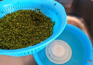 あく抜きは下ゆでする方法とひと晩水でさらす方法がありますが、前者は風味が弱まり、後者は時間がかかるので、両方の良いとこどりするために5時間で頻度高く水を替えてアクとり時間の短縮を図りました。ざるにしその実を入れて流水で流してからボウルで水にさらします。1時間に1回、水を替えてアクをとります。5時間程度で大方あくやえぐみはとれたのでこの方法でも良いかも知れません。あとはキッチンペーパー等で水気をふき取ってください。