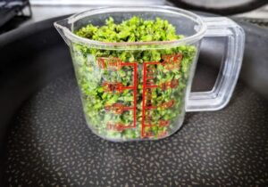 上記の調味料を鍋に入れて、水気をとったしその実(下のカップの3杯分)と上記の調味料を入れて煮詰めていきます。水分が減ってくるとあまり煮詰め過ぎないように火を止めます。水分を完全に飛ばそうと煮詰め過ぎると粘りが出てしまって料理に使いにくくなります。冷やすとさらに固まるので、ちょっとシャバシャバかなと思うぐらいでちょうど良いと思います。