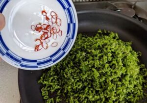 5.⑧を入れて混ぜて直ぐに火を止め、余熱でニラに火を通せば出来上がり