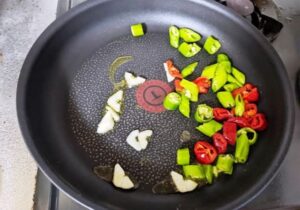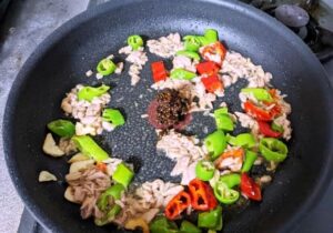 3.ニンニクに焦げ目がつけば、⑤⑥を入れて混ぜる