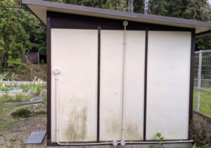 見た目は写真の通り、まだ使えそうなのですが、中身はかなり使い込まれていて、壁も劣化していました。残念ながらあまりの汚さに写真を撮るのを失念しており、衝撃映像を共有させて頂くことはできないのですが、2枚目の写真から中の状態を連想して頂ければと思います。分かりにくいのですが、倉庫の裏側の上部の屋根の下板は風雨で剥がれ落ちている部分から、倉庫内への浸水もありました。