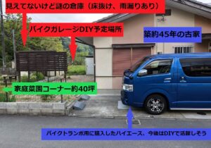 ということで、掃除は早々に切り上げて、倉庫のDIY基地化にとりかかりました。左の写真では柵の陰に隠れていて見えにくくなっていますが、6畳ほどの広さの倉庫で、前に住まれていた方は使用されていなかったようで、腐敗で床が抜けていて少しながら雨漏りもしていました。この倉庫のDIY基地化に毎週土日の計5週の10日間を要することになりました。DIY初心者には、なかなか手応えのあるタスクでした。