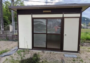 見た目は写真の通り、まだ使えそうなのですが、中身はかなり使い込まれていて、壁も劣化していました。残念ながらあまりの汚さに写真を撮るのを失念しており、衝撃映像を共有させて頂くことはできないのですが、2枚目の写真から中の状態を連想して頂ければと思います。分かりにくいのですが、倉庫の裏側の上部の屋根の下板は風雨で剥がれ落ちている部分から、倉庫内への浸水もありました。