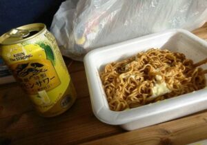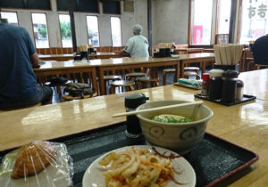 どこで車中泊するかノンプランだったので、国道沿いにある超大型有料駐車場に駐車してひと晩明かしました。天候も悪かったので、ハイエースに積んでいた非常食用のカップ焼きそばで食事を済ませて直ぐに寝ました。翌朝、起きて直ぐに大阪に帰ろうかとも思ったのですが、朝ごはんぐらいちゃんとしたものを食べて帰ろうと、ググったところ、近くに朝から営業しているさかなメインの食堂があったので寄ってみました。