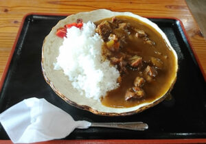 それでは剣山林道ツーリングスタートです。といっても林道に入ってすぐにランチにしました。言わずと知れたファガスの森さんです。ここで鹿肉カレーを頂きました。鹿肉がたっぷり入っていて、味も臭みがなくて、うまみ十分で大満足でした。走り出して約7㎞のところにあるので、休憩地点としては早めですが、ここで路面の情報や通行規制について、反対側から来たライダーさんや店員に聞いて行くと安心です。