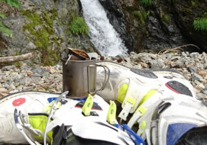 また、5.5Lタンクのフリーライドだとガス欠の恐れがあるので、リュックに携行缶(1L×2本)を入れて行きました。少な目に見積もってフラット林道や舗装路なら1Lで25㎞は走れるので、計算上はタンクと携行缶合わせて走行距離約190㎞までは大丈夫です。ということで、もしガソリンスタンドが無くてもギリギリ戻って来れる範囲です。
