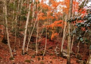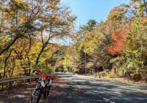 京都では高原リゾートして有名なるり渓温泉の駐車場にバイクを停めて、そこから河原に降りて渓谷の紅葉を散策することができます。11月になるととてもキレイなのでぜひ歩いてみてください。昨年の12月前半に行った時の写真を添付しておきます。この時はすでに紅葉というよりは落葉でしたが、地面が真っ赤に染まって、これはこれで素晴らしい景色でした。