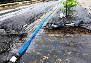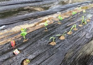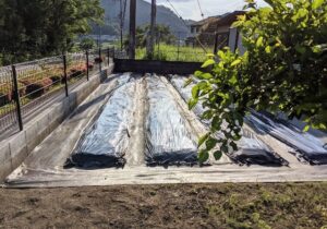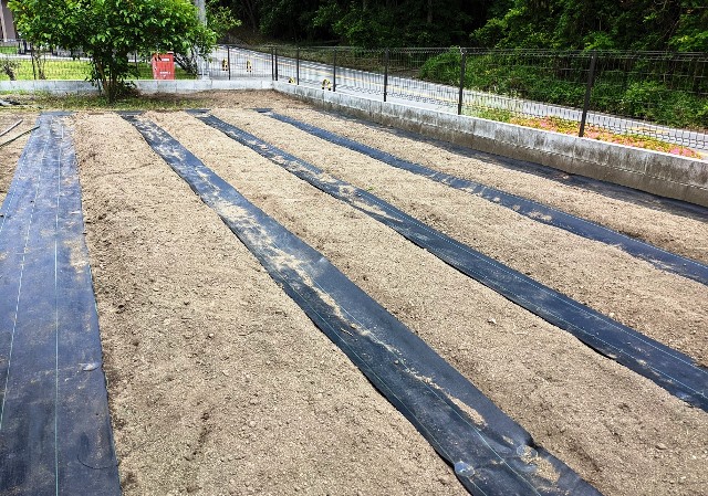 はじめに土づくりをしました。「土壌材すくすく高品質熟成樹皮たい肥」「鶏ふんたい肥粉」「もみ殻」「苦土石灰」「化成肥料8-8-8」といったものをYouTube先生のご指導を仰ぎつつ混ぜ込んで、ひたすら人力(鍬1本)で耕しました。それから通路に防草シートを張り、畝の上にマルチ(黒)を張って防虫対策をしました。