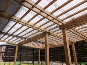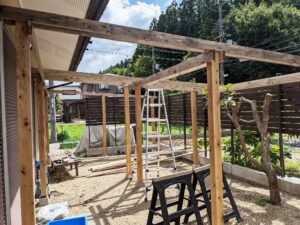 いよいよガレージスペースに入って作業開始です。束石(高さ250㎜コーナン)を等間隔に並べてその固定用金具に柱をあてがい木ねじで固定していきます。1本ずつ単体では転倒しますが、梁を同時に固定することで何とか自立してくれました。1人での作業はこの梁を固定することが難しかったです。片方を脚立(Alinco伸縮脚立2,100㎜PRW210FX)に乗せて、もう片方を自分がもってもう一方の脚立に乗りクランプで仮固定して、再度反対側もクランプで固定して、それからドリルで下穴をあけて木ねじで固定するという手順を繰り返しました。この脚立が良いのは4本の脚の高さが独立して変えられるところです。外でDIYするときに地面が平らなことはほぼないので4本脚の高さを変えて水平に保てるところが重宝します。