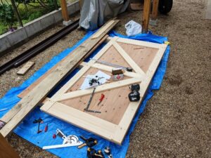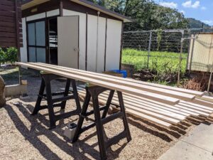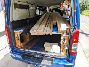 ②ガレージスペースに雨よけ用の柱を立てます。まずは資材をロイヤルホームセンターで購入しハイエースで搬入しました。長さ4mの木材も積めるハイエースの懐の深さに感動しました。一度ハイエースに乗ると次もまたハイエースを購入する人が多いと聞きますが、その気持ちが分かりました。柱をくみ上げるその前に木材に防腐用に塗料(カンペハピオ油性木部保護塗料ピニー3.2L)を塗りました。この作業が手間と時間を要しました。特に2度塗りするために乾かす時間が夏場でも4時間程度かかりました。