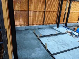 ⑤コンクリートの床への流し込みです。こいつは大物でした。面積が広かっただけでなく、コンクリートは混ぜた直後から固まり始めるので時間との勝負なところがあり、平らにならしている間に練ったコンクリートが固まり出すということを繰り返さなければならず、小休止する暇がない状態が続きました。