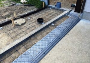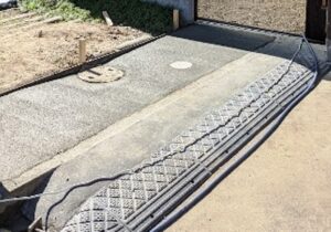 2㎡程度ならともかく、ある程度の面積をコンクリート施工するときは必須だと感じました。羽根は付属のもので十分でした。YouTube先生のアドバイスを観て追加で蝶の羽型のものを購入しましたが必要ありませんでした。作業としては段差プレートをアンカー(TRASCOオールアンカーSCステンレスM8×50)で固定し、一段上がっているブロックと段差プレートの間にコンクリートを流し込み、さらに奥側の砂地部分を掘り起こし汚水管の蓋の高さをあげて高さを合わせ、あとは排水溝に少しだけ傾斜をつけて仕上げました。砂地部分のコンクリートは高さ10㎝程度あったので、間にワイヤーメッシュを入れて補強しましあ。ワイヤーメッシュを高さ10㎝の中間にもってくるためにピンコロ(5㎝角のコンクリートブロック)をかませてコンクリートを流し込みました。あと滑り止めにデッキブラシの先でコンクリートに細い線を入れました。なんだかガレージの中をDIYする前に全体力を消耗した感じですが、めげずに中に攻め入りました。