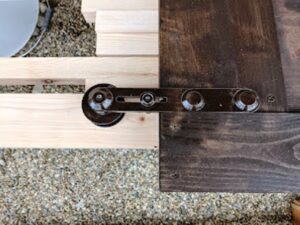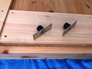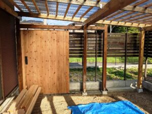 続いて4㎝角の垂木を25㎝間隔で横に這わせてその上にポリカーボネート製の波板をはりました。2.5山を重なり合わせるという基本的なやりかたで、専用の留めねじを使って固定しました。昨年、猛烈な台風が上陸しましたが、変な音を立てることもなくしのげたので、強度的にはいい感じに仕上がっています。③扉も写真の通りDIYしてみました。上部にローラー(左下写真)をつけてスライドさせるタイプですが、風対策も考え、下部も円柱のガイドローラー(ダイケンドアハンガーニュートンN20GRO)がステンレス溝(リップガイドレール ステンレス♯3 SN-GR 2730)を通る仕様にしました。既成の合板では900㎜幅のものしか手に入らなかったので、あと300㎜は写真のものに継ぎ足してつくりました。
