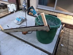 ①上写真の右側からバイクを奥のガレージスペースに乗り入れます。GSX1300R隼が通れる幅を目安に扉を大きくし過ぎないように図面を書きました。スロープは段差プレート(アイリスオーヤマ段差スローププレート幅900㎜段差100㎜NDP-900Eグレー)3個とコンクリート(ボルトランドセメント25㎏1:川砂20㎏2:バラス18㎏4の比率で混合)と水適量という感じで混ぜました。はじめはトロ船に入れてスコップで混ぜていましたが、腰が悲鳴を上げたので撹拌機(Makitaカクハン機羽根径165㎜UT1305)を購入しました。