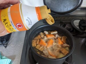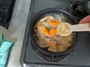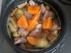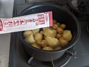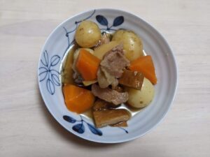 採りたてのジャガイモ(小粒のものを先に消化)をどうやって食べようかと考えて、冷蔵庫と冷凍庫にあるもので調理してみました。細切れにして冷凍していた和牛の筋肉と生姜のスライス、平天、ニンジンで肉じゃがならぬ牛筋じゃがにしてみました。味付け肉じゃがなので、レシピというほどではありませんが、顆粒の鰹だしを使って簡単に仕上げてみました。