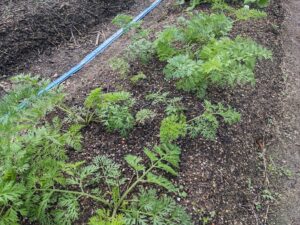 12月初旬の畑の状態としては、ニラが霜やけしていたり、レタス系の成長が止まっていたり、玉ねぎの成長が極端に遅かったり、寒さにやられ加減です。一方、ニンジンやかぶら、ニンニク、イチゴは良い感じに成長していて、白菜は結球するのか、微妙な感じです。