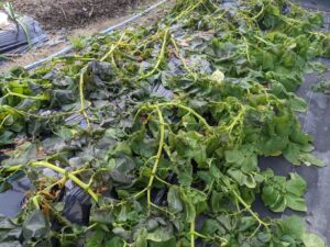 11月の後半から仕事が本格化したことで、能勢の菜園に来たのは10日振りです。気温も低下してきたので、雑草が伸び放題といったことは無いのですが、12月2日の冷え込みで霜が降りたようで、パプリカ(1枚目の写真)やジャガイモの葉(3枚目の写真)が凍結してしおれてしまっていました。