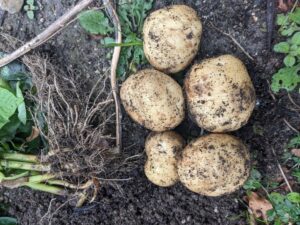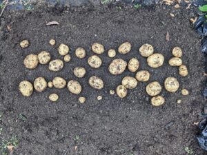 小さいものもありましたが、意外と良い感じに成長していて、上の写真の畝幅で写っているだけのジャガイモが収穫できました。多いのか少ないのか初めてなので分かりませんが、虫食いもなく美味しそうに出来上がっていたので大満足です。