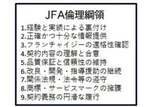 FC本部が担う役割と機能について、日本フランチャイズチェーン協会(以下JFA)が発表している倫理綱領から考えていきたいと思います。倫理綱領の詳細についてはJFAのホームページに掲載されているので、そちらをご確認ください。ブログではこの9項目について、実例を交えて、どのように整備していけば良いのかを考えてみたいと思います。