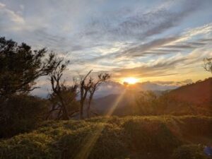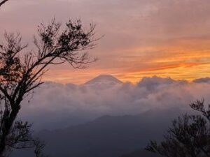 山頂のみやま山荘から観る眺望は最高です。富士山方面に夕日が沈んでいくので、季節によっては富士山の山頂に夕日が沈んでいくシーンが観られそうです。今回は右に若干ずれているものの感動的なほど美しい夕日を観ることができました。写真に残すことはできなかったのですが、月が隠れた4時頃の星空も素晴らしかったので、山荘に泊まったかいがありました。